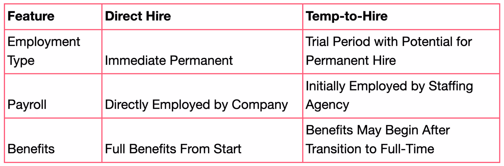 While Direct Hire offers immediate permanent employment, Temp-to-Hire positions function as a trial period before transitioning to a full-time role.  Here's a table highlighting the key differences: